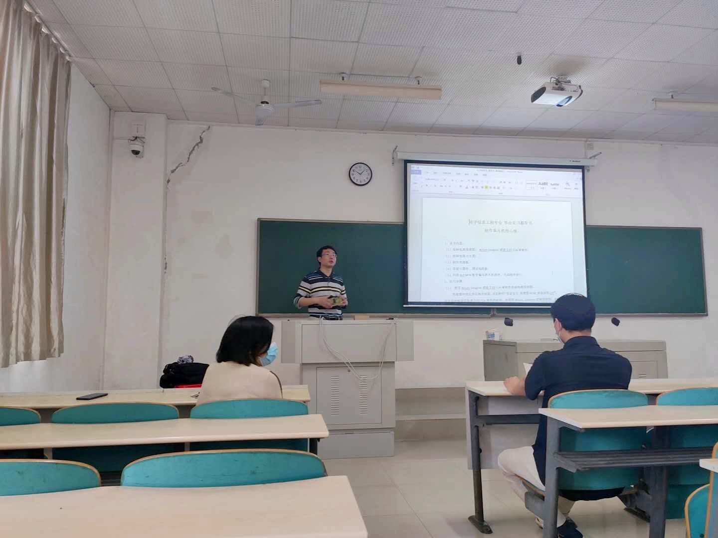 贺科学老师在会上对毕业实习内容和步骤、安全注意事项、实习报告要求等进行了详细地讲解,黄亚飞老师对毕业实习和毕业设计(论文)工作的衔接及相关时间节点作了说明。会上,老师们还为学生进行了疫情防控及实习心理辅导,学生坚定了做好毕业实习的决心和目标,为自己本科期间的专业实践画上圆满句号。