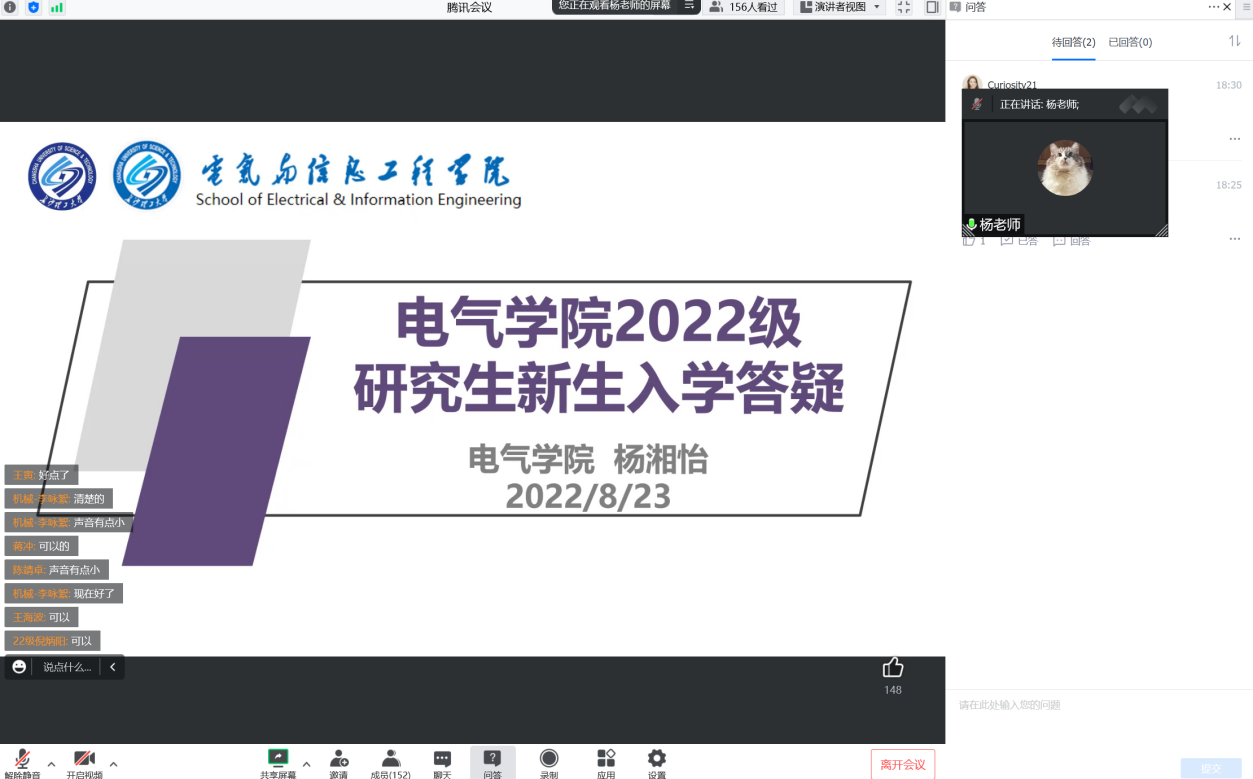 开启新学期,立足新起点,迈上新征程。8月23日晚18:30,电气学院线上召开2022级研究生新生答疑会暨院研会招新宣讲会。会议由研究生辅导员杨湘怡主持并答疑,电气学院院研会骨干及2022级全体研究生新生参会。