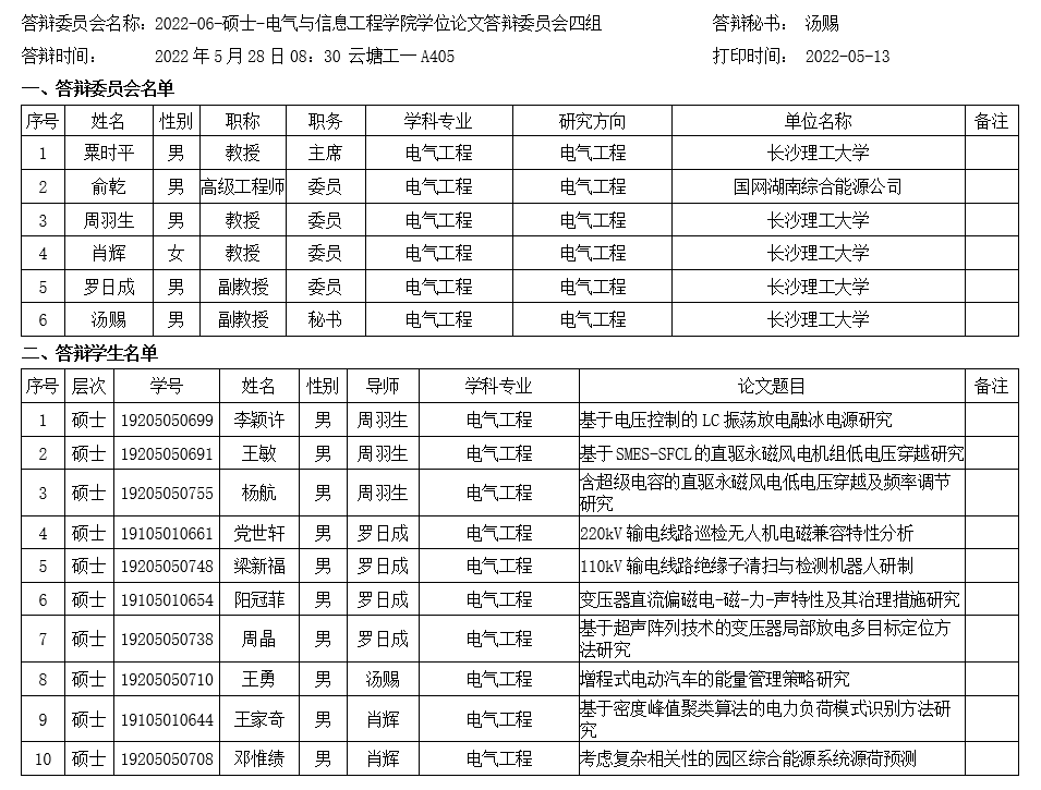 电气与信息工程学院2022年6月毕业研究生答辩安排(四)已发布,请相关同学提前打印准备好《答辩表决票》、《答辩安排表》、《答辩申请表》,于答辩前5个工作日提交得到工一B501研究生办完成盖章并做好相关答辩准备。