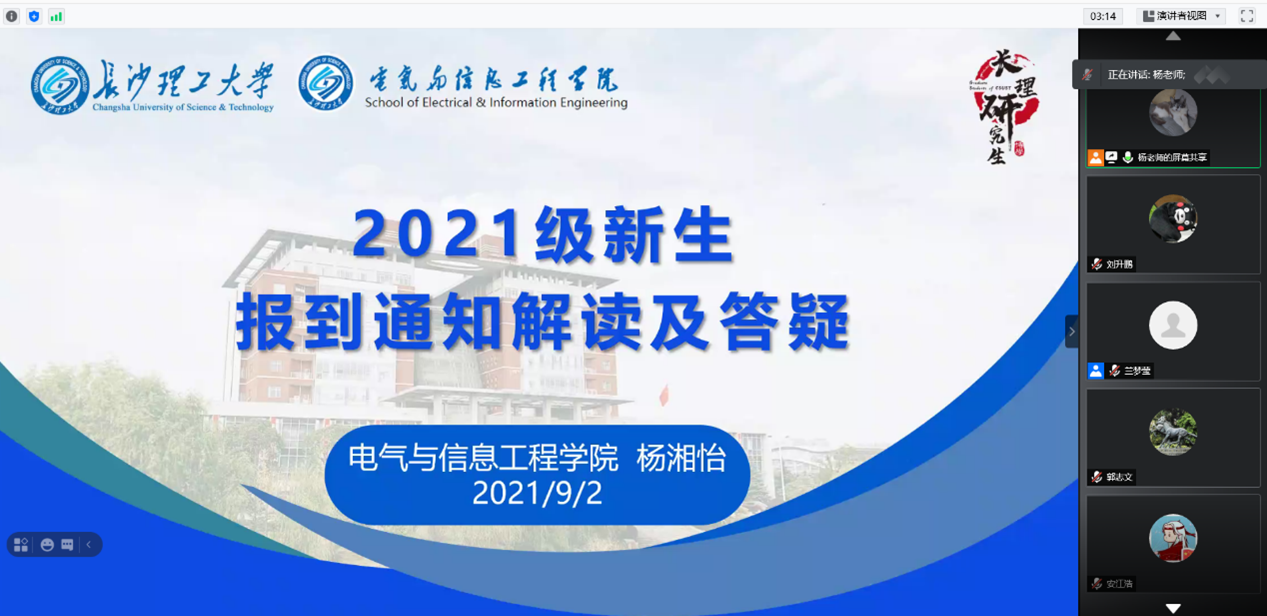 新学期,新目标,新起点,新征程。9月2日晚19:00,电气学院线上召开2021级研究生新生答疑会暨院研会招新宣讲会。会议由研究生辅导员杨湘怡主持,会议邀请科研办兰梦莹、学工办李晨璐参与答疑,电气学院院研会骨干及2021级全体研究生新生参会。