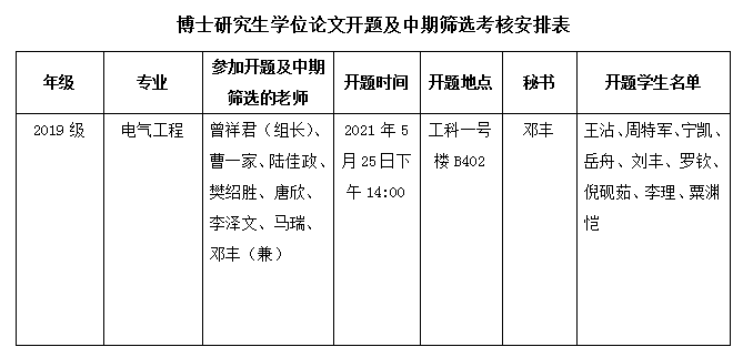 电气工程博士研究生组开题及中期筛选考核安排已公示,请大家提前填写好《MG冰球突破官网研究生论文开题报告表》与《研究生中期筛选考核评定表》,做好答辩准备。