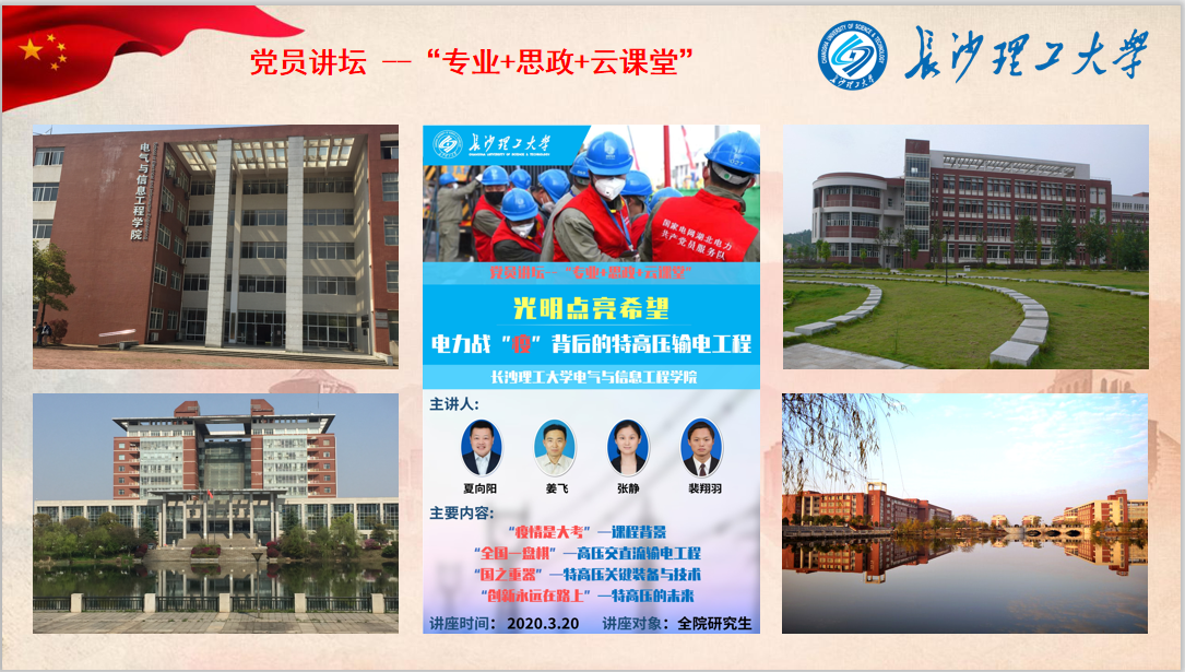 近日,电气学院的云上“党员讲坛”和“课程思政”正在进行中 。3月20日下午,电气学院面向全体研究生开展疫情下的专业思政课“光明点亮希望——电力战“疫”背后的特高压输电工程”,本次云课堂由副院长、博士生导师夏向阳教授牵头,姜飞、张静以及裴翔羽四位党员教师共同主讲。