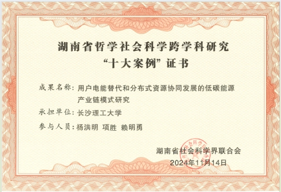 近日,湖南省社会科学界联合会公布了湖南省哲学社会科学跨学科研究“十大优秀案例”和“十大案例”名单,我院杨洪明教授的研究成果《用户电能替代和分布式资源协同发展的低碳能源产业链模式研究》分别荣获湖南省哲学社会科学跨学科研究“十大案例”。