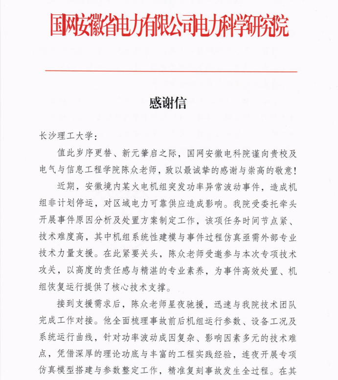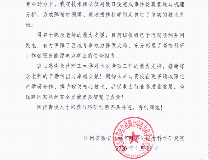 国网安徽电科院特致函学校,感谢学校对本次任务的鼎力支持,感谢陈众教授的辛勤付出与卓越贡献!为有力保障区域冬季电力保供大局,充分彰显了高校科研工作者服务能源电力事业的使命担当。