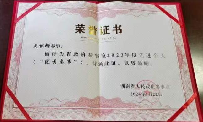 近日,湖南省政府办公厅公布2023年度参事工作表彰名单,MG冰球官网参事成松柳教授获评先进个人(“优秀参事”),多份调研成果被评为优秀建言。
