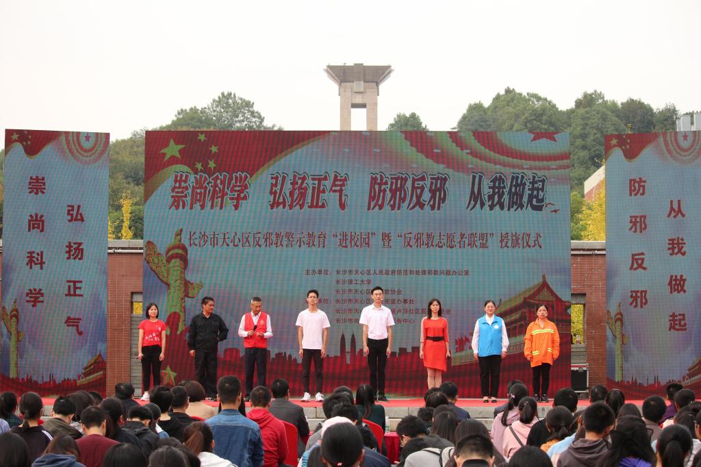10月23日,天心区反邪教警示教育“进校园”暨“反邪教志愿者联盟”授旗仪式活动在MG冰球官网云塘校区文化广场举行。长沙市防范办、长沙市反邪教协会、天心区政法委、天心区防范办、天心区反邪教协会和天心区暮云街道的相关领导、部分师生、居民群众等近3000人参加了此次活动。校党委委员付嫦娥,校党委委员、宣传部部长方琼出席。