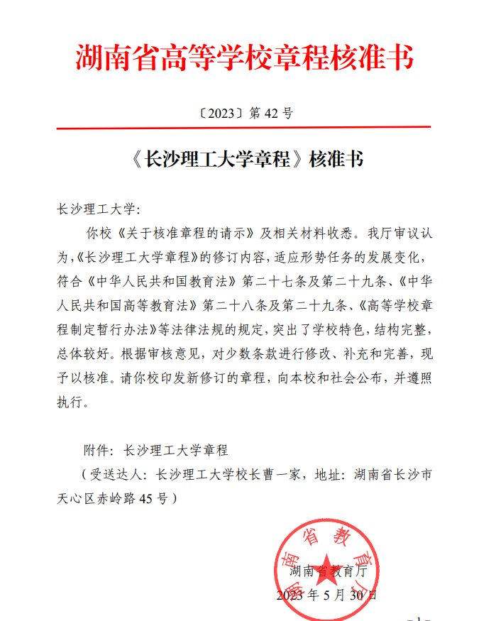 近日,湖南省教育厅以湖南省高等学校章程核准书(〔2023〕第42号),核准通过了MG冰球官网新修订的《MG冰球突破官网章程》。