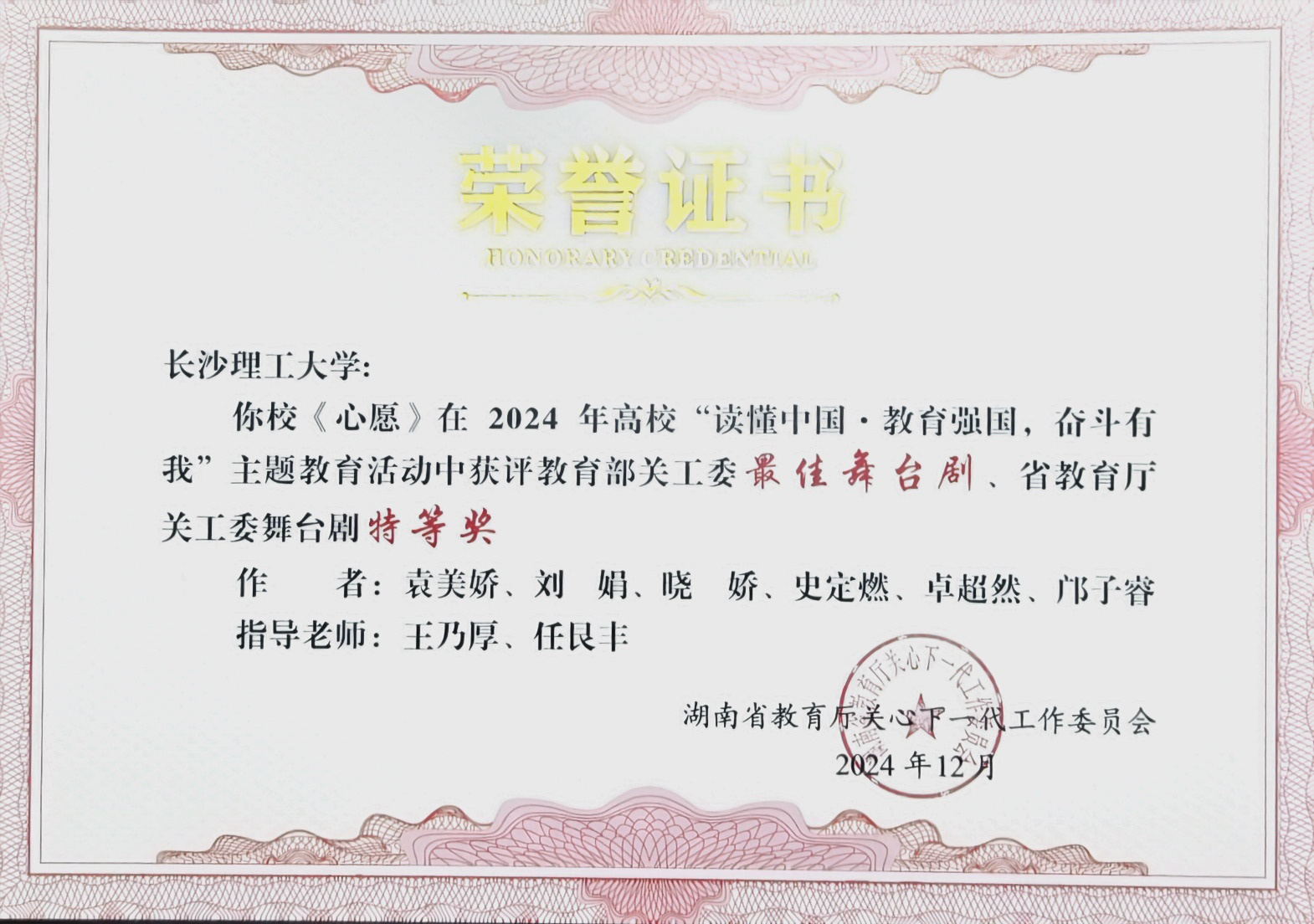 MG冰球官网报送的舞台剧《心愿》荣获教育部最佳舞台剧(全国排名第1)和教育厅舞台剧特等奖、征文《举灯人》荣获教育厅征文一等奖,MG冰球官网关工委同时荣获教育部及教育厅优秀组织奖。