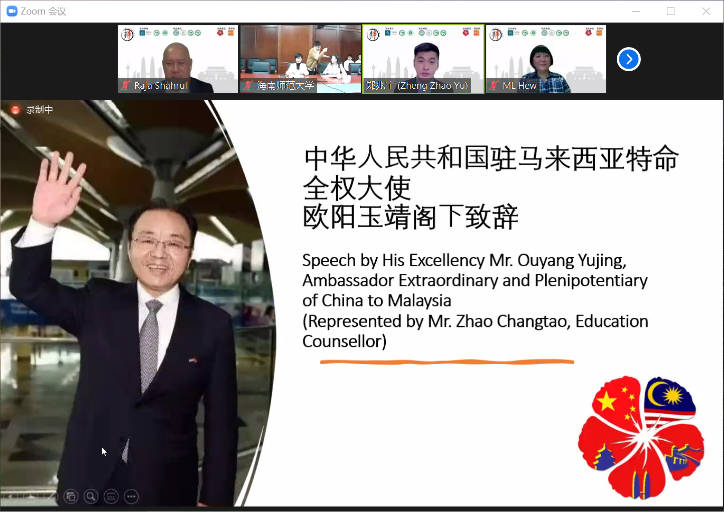 中国驻马来西亚大使欧阳玉靖先生的开幕式致辞表示,中马历来是好邻居、好伙伴,面对当今世界诸多挑战,辩论赛既是两国大学生以辩明道,以论证言的交流互鉴平台,也是展示中华语言和文化魅力的平台。他希望同学们共赏中华语言之美,共筑中马友谊之桥,共创美好光明未来。同时,他向在马来西亚从事汉语教学、传播中国文化的教师和志愿者、向孔子学院及合作院校和中马各界友人对辩论赛的付出和支持表示感谢。中国驻马来西亚大使馆教育参赞赵长涛先生宣读了致辞。