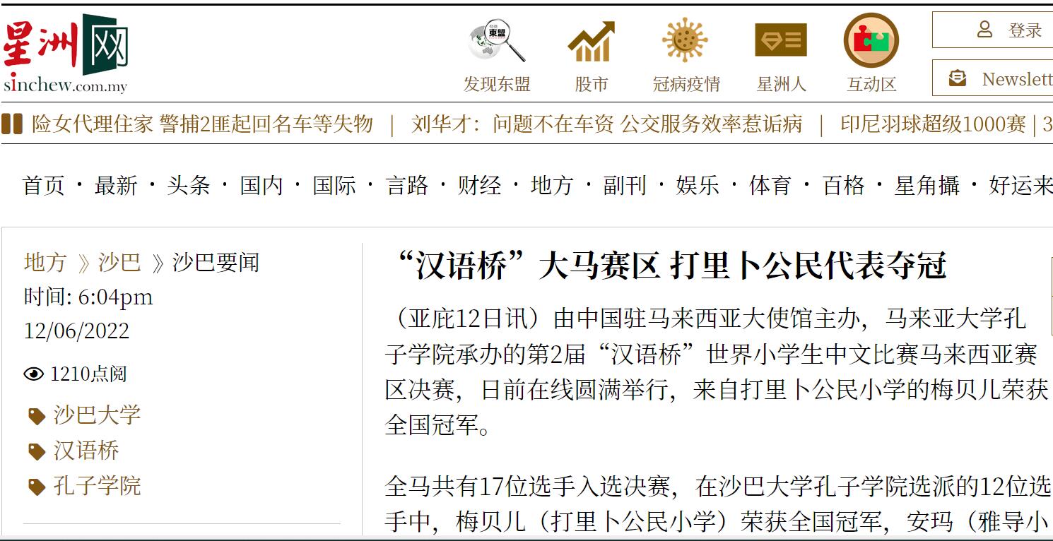 6月11日,来自沙大孔院的小选手梅贝儿夺得第2届“汉语桥”小学生中文比赛马来西亚赛区冠军,《亚洲时报》《星洲日报》等多家媒体对此进行了报道。本年度“汉语桥”比赛沙大孔院收获颇丰,在中小学组别共有15位选手获奖,引起广泛社会关注。连日来多所学校与机构前来孔院接洽文化活动合作事项。