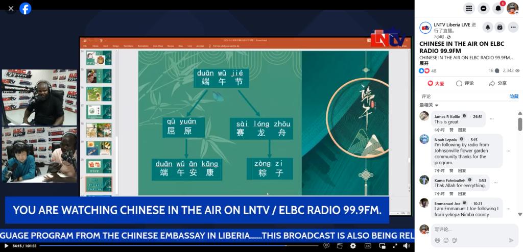 当地时间2025年5月31日,MG冰球官网与利比里亚大学合办的孔子学院在利比里亚国家广播电台《空中汉语》栏目播出了2025年端午节专题节目。节目通过国家广播电台官方脸书页面(ELBC FM99.9)同步直播,吸引了大量听众和观众参与,反响热烈。