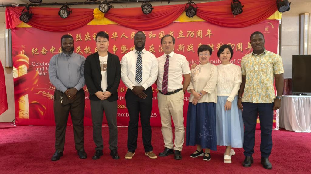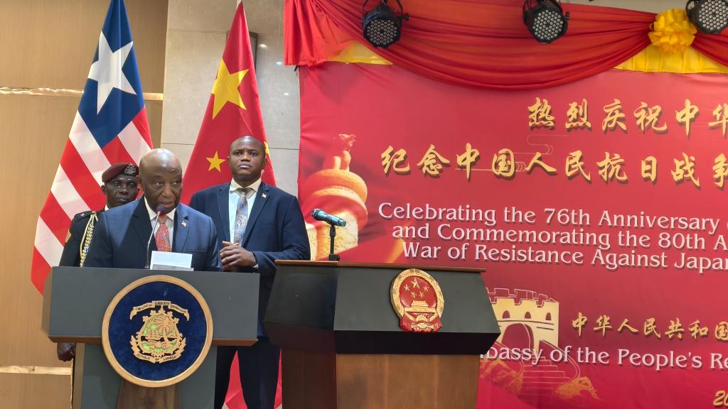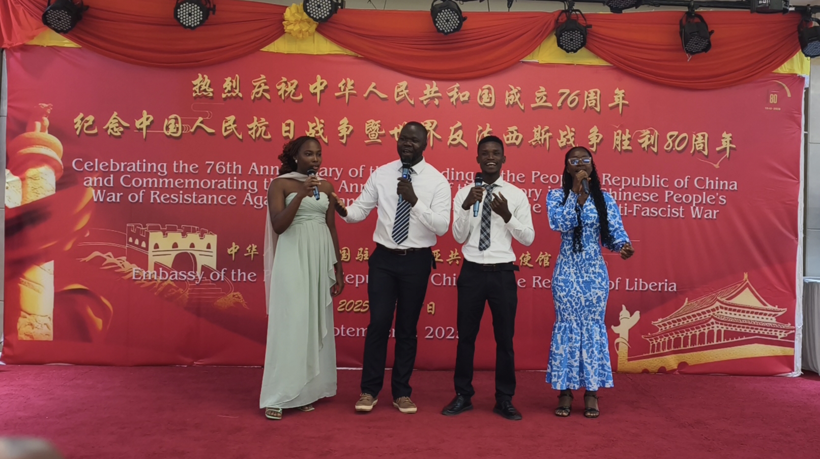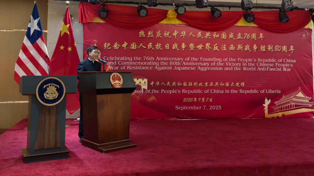 当地时间2025年9月7日晚,中国驻利比里亚大使馆大使馆庆祝中华人民共和国成立76周年,纪念中国人民抗日战争暨世界反法西斯战争胜利80周年国庆招待会在蒙罗维亚部长楼隆重举行。利比里亚总统博阿凯(Joseph Nyuma Boakai)阁下应邀出席并发表热情洋溢的致辞,利国政府多位部长、各国驻利外交使节、中资机构及华侨华人代表等三百余人齐聚一堂,共同祝贺盛世华诞。