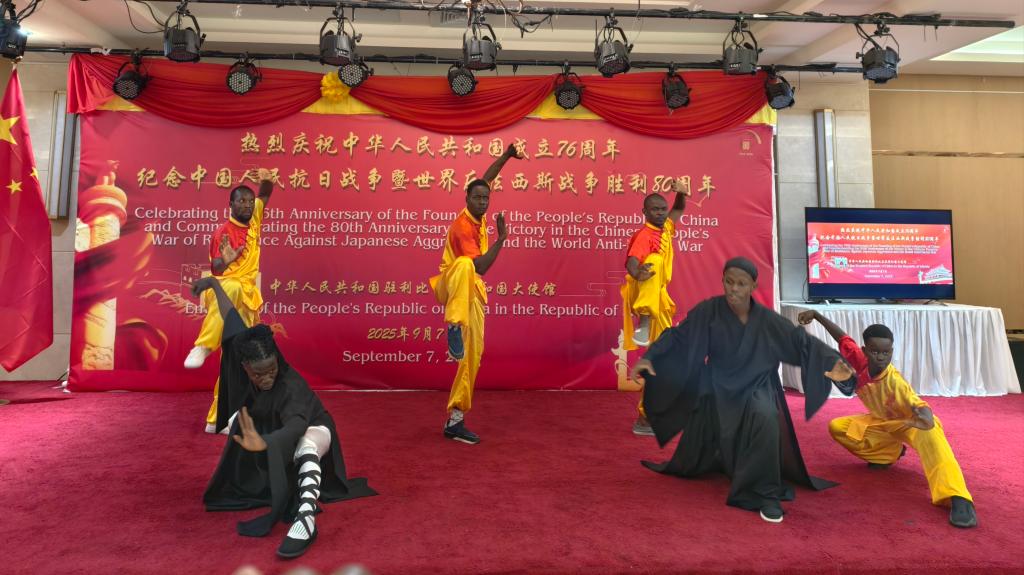 文艺表演环节气氛热烈,一段由利比里亚大学孔子学院师生精心准备的表演成为了当晚活动的亮点之一。孔院师生以深情的歌声演唱了脍炙人口的歌曲《如愿》,用音乐这一无国界的语言,表达了对中国国庆的真挚祝福和对两国友谊的美好祝愿。随后,一场孔院学生参与的力与美的视觉盛宴开启,武术队员表演了拳术、刀术等节目。高难度的空翻、精准的招式和对练引来外国友人喝彩不断。