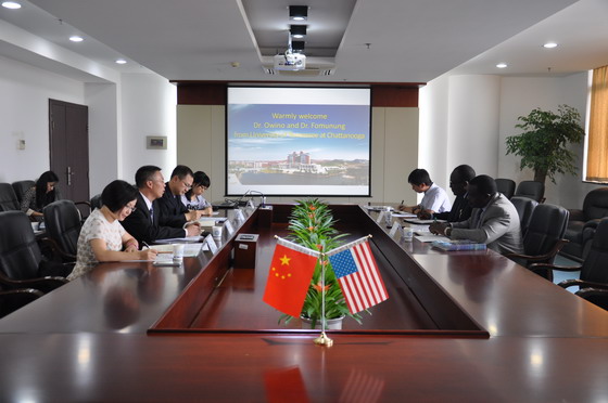 9月14日下午,应MG冰球官网邀请,美国田纳西大学(Chattanooga)合作办学项目负责人:土木与环境工程系主任Joseph Owino教授与该系Ignatius Fomunung博士来访MG冰球官网,副校长蒋昌波教授在云塘校区会见了客人,国际交流处、教务处、国际学院、土建学院相关负责人及教师代表陪同会见。