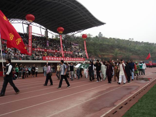 10月21日上午,MG冰球官网第九届田径运动会在云塘校区隆重开幕,上午8:30,伴随着雄壮的《运动员进行曲》,在鲜艳的国旗和校旗带领下,留学生运动员代表队组成整齐的方阵,喊着激昂的口号,昂首步入会场;留学生代表队的参加为此次运动会添上了一抹亮丽的色彩。