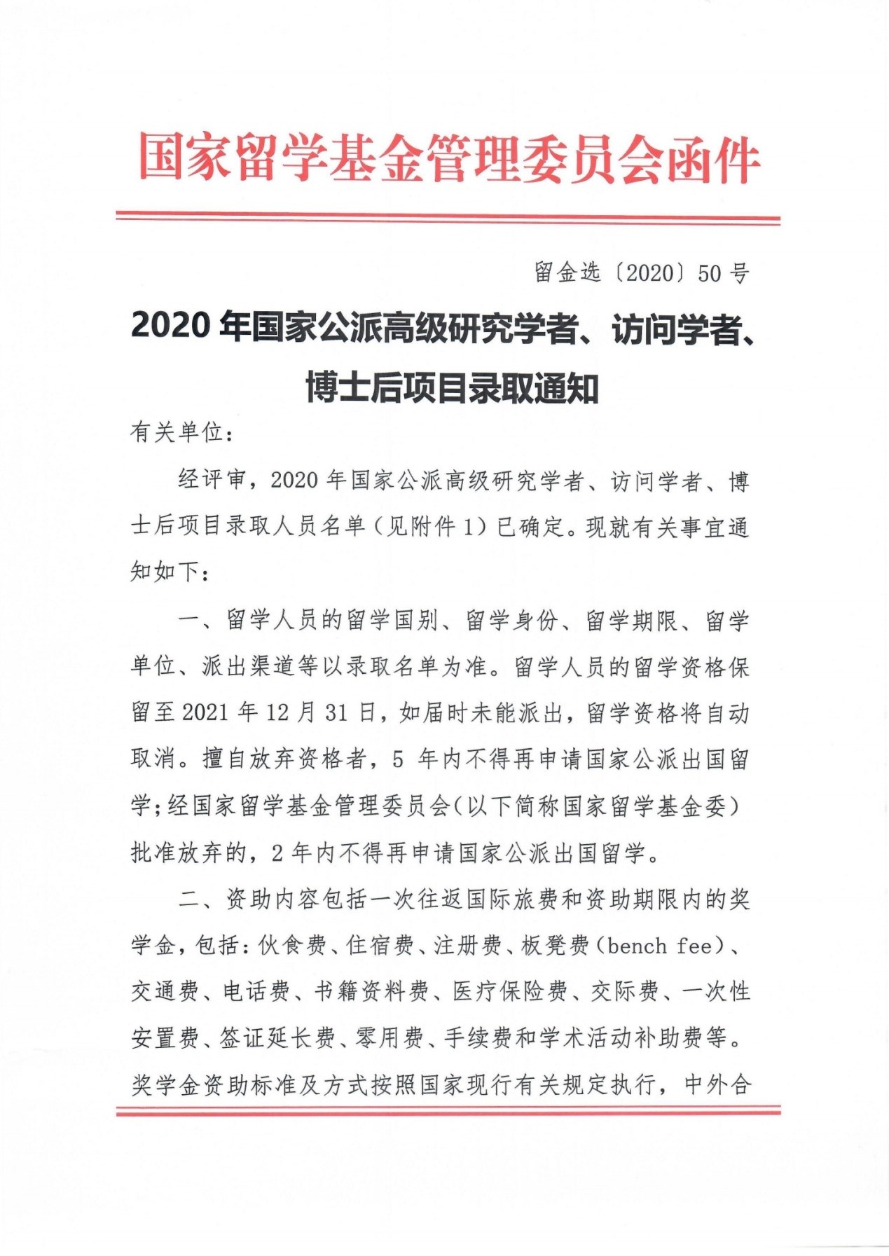 近日,国家留学基金管理委员会(以下简称“国家留基委”)公布了“2020年国家公派高级研究学者、访问学者、博士后项目(面上项目)”录取结果,根据国家留学基金委函件(留金选〔2020〕50号),MG冰球官网巨锁基等14位申报该项目的老师全部被录取,录取率达100%(名单附后)。