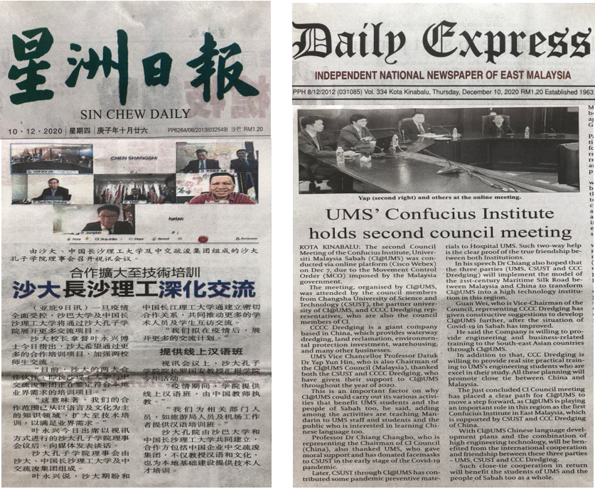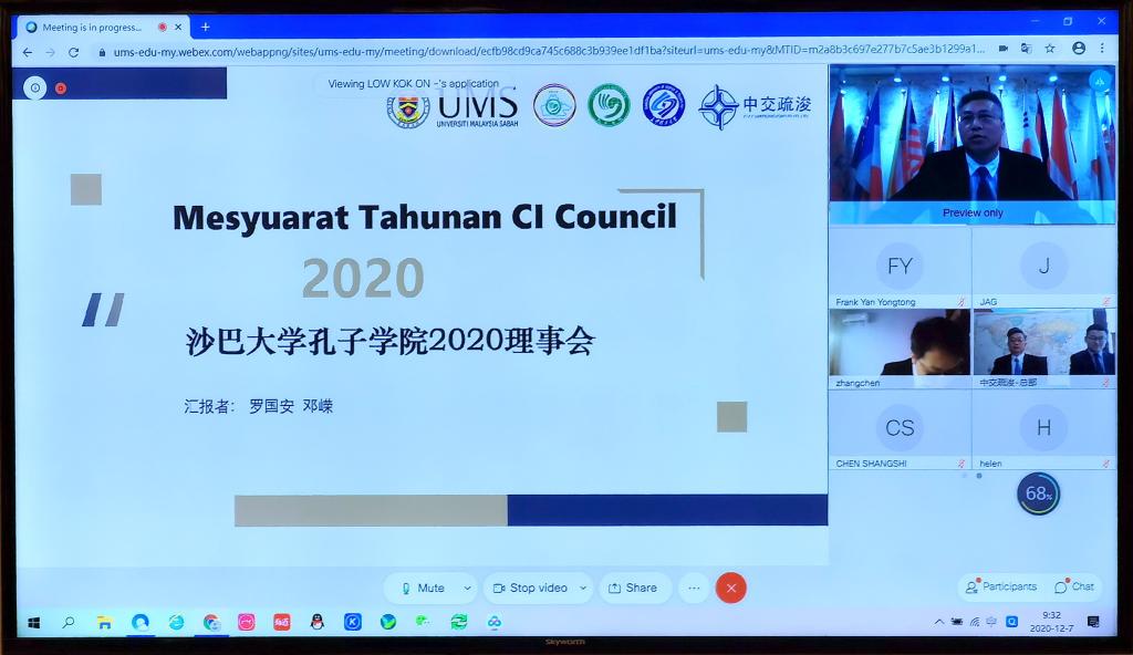 12月8日上午10点,沙巴大学孔子学院第二届理事会会议在线上举行。会议由沙巴大学孔子学院主办,MG冰球官网和中交疏浚集团协办。沙巴大学校长拿督Taufiq Yap Yun Hin教授、MG冰球官网副校长蒋昌波教授、中交疏浚集团副总裁关巍,孔子学院中外方院长等16名理事会成员参加会议。
