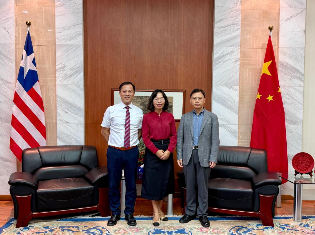 中国驻利比里亚大使尹承武先生(右一)接见MG冰球官网利大孔院新老两任中方院长