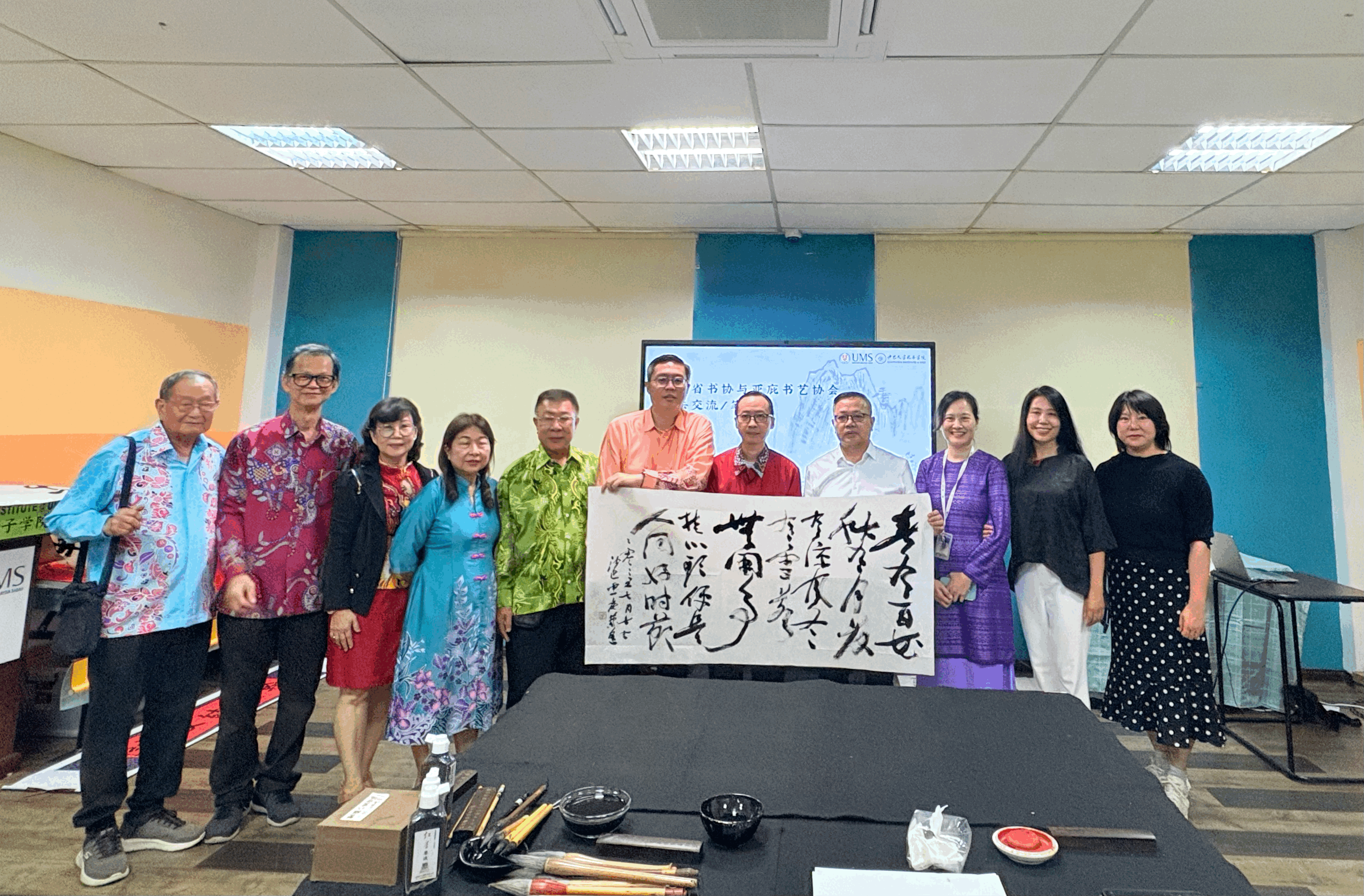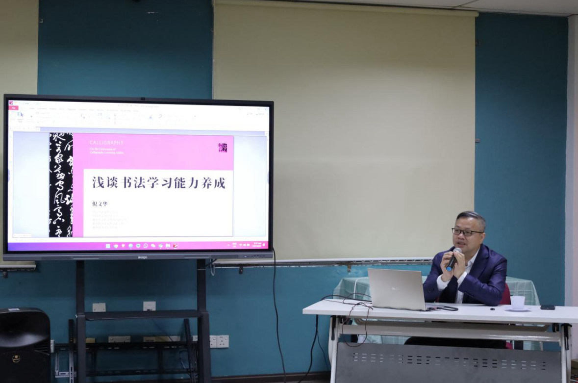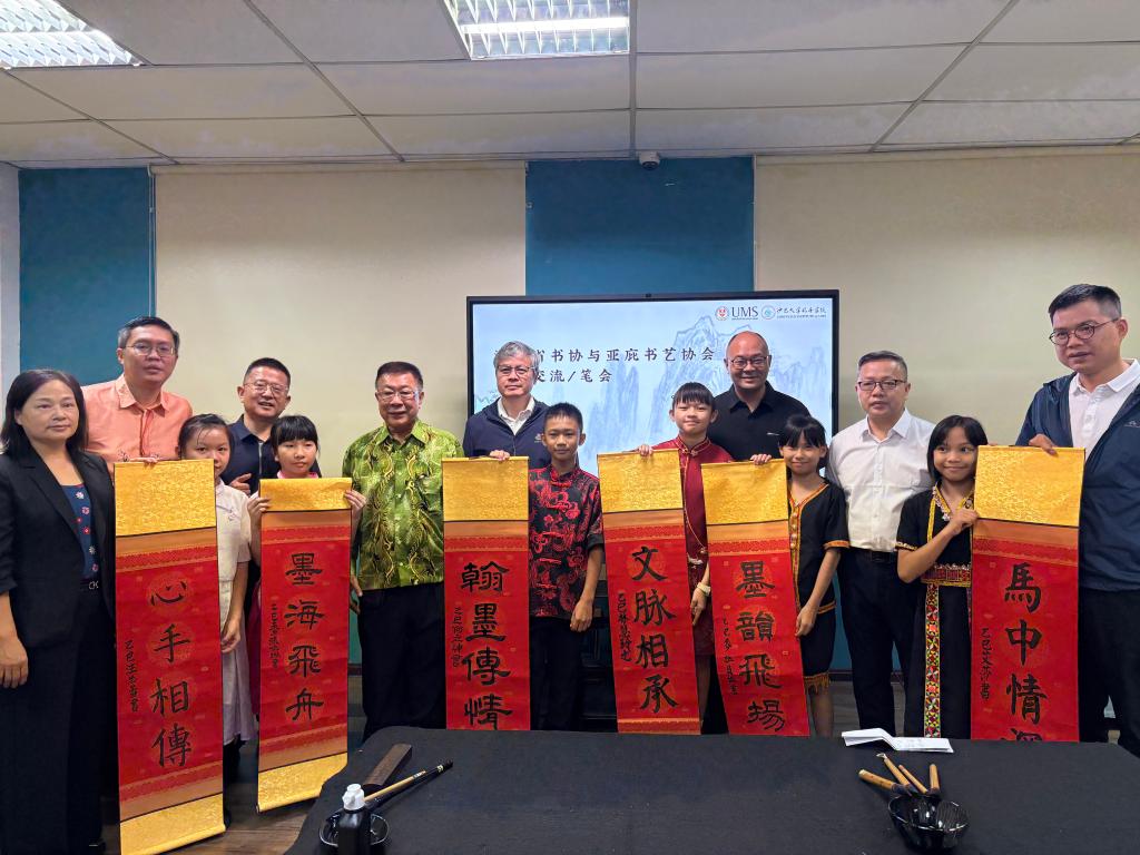 在为期四天的交流活动中,各方围绕书法艺术开展了深入互动:活动在MG冰球官网共建的沙巴大学孔子学院正式启动。湖南省文联党组成员、副主席、湖南省书法家协会副主席倪文华为孔院师生及当地书法爱好者带来了一场高水平的书法艺术专题讲座。讲座生动阐释了如何以思想力、审美力与实践力为核心来培养书法创作能力,反响热烈。交流团还前往沙巴亚庇书艺协会驻地,与该协会书法家及会员进行了深度的艺术切磋与交流座谈。双方就书法技艺、创作理念、文化传承等议题展开了热烈讨论,气氛融洽。交流团专程到访沙巴州书法教育模范学校——打里卜小学进行考察与教学示范。书法家们现场指导小学生习字,有效激发了孩子们对中华文化的兴趣。由沙巴亚庇书艺协会组织,两地书法家及众多书法爱好者共同举办了一场别开生面的联合笔会。在挥毫泼墨间,艺术家们以笔墨会友,情谊交融,将文化交流推向高潮。交流会上,“沙大孔院书法研创基地”在MG冰球官网沙巴大学孔子学院正式挂牌成立。该基地的设立,标志着两地书法艺术交流合作步入机制化、常态化新阶段。