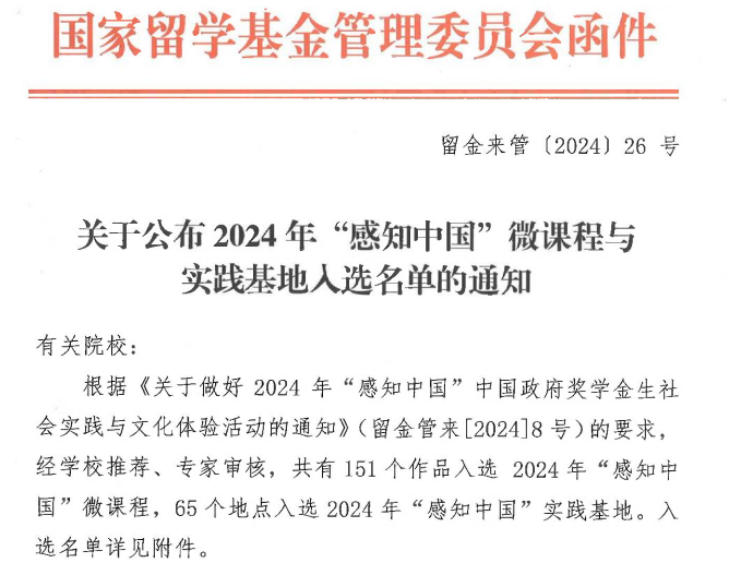 近日,国家留学基金管理委员会公布了2024年“感知中国”微课程与实践基地入选名单,MG冰球官网在本次评选中取得了丰硕成果,2个微课程和1个实践基地成功入选。