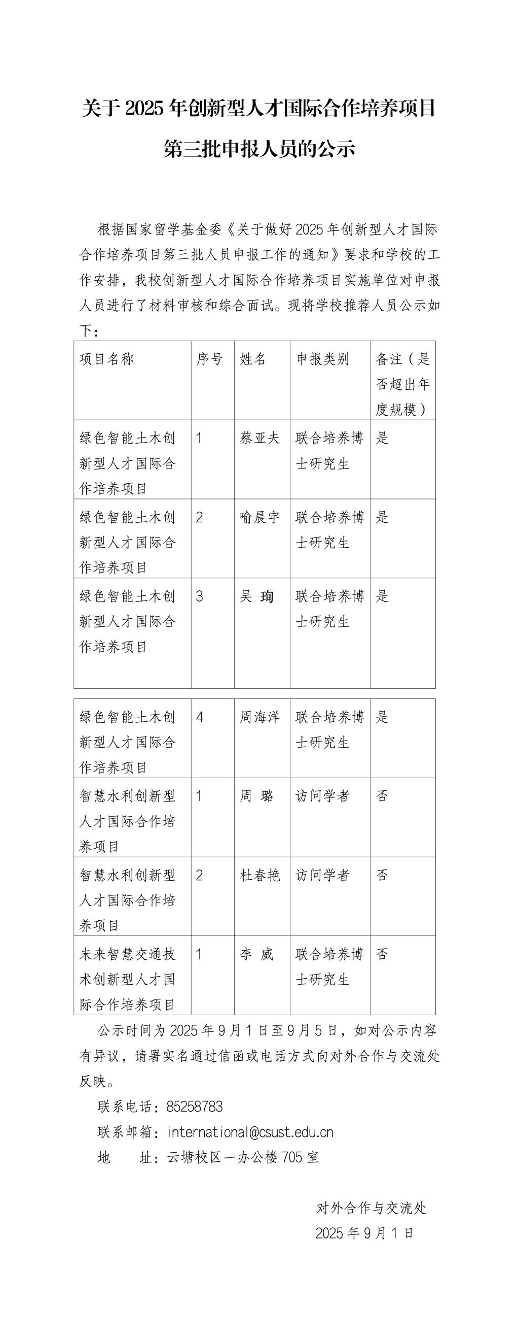 关于2025年创新型人才国际合作培养项目第三批申报人员的公示