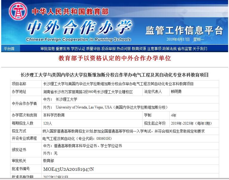 MG冰球突破官网与美国内华达大学拉斯维加斯分校合作举办电气工程及其自动化专业本科教育项目于2018年获得教育部批准(编号:MOE43U2A20181947N),融合两校强势专业“电气工程”之优势,严格遵守《中外合作办学条例》和《中外合作办学条例实施办法》办学,紧密依托国际化、专业化的高水平管理团队运行。该项目融合中美双方优质教育资源,精心打造人才培养方案,其中1/3以上核心课程采用美方原版教材、师资、教学方式等优质教育资源,培养兼具国际化视野与家国情怀、拥有创新精神和跨文化交际能力、系统掌握电气工程专业基础理论知识和现代工程技术、具备良好科学素养与工程实践能力的应用型高级专门人才。