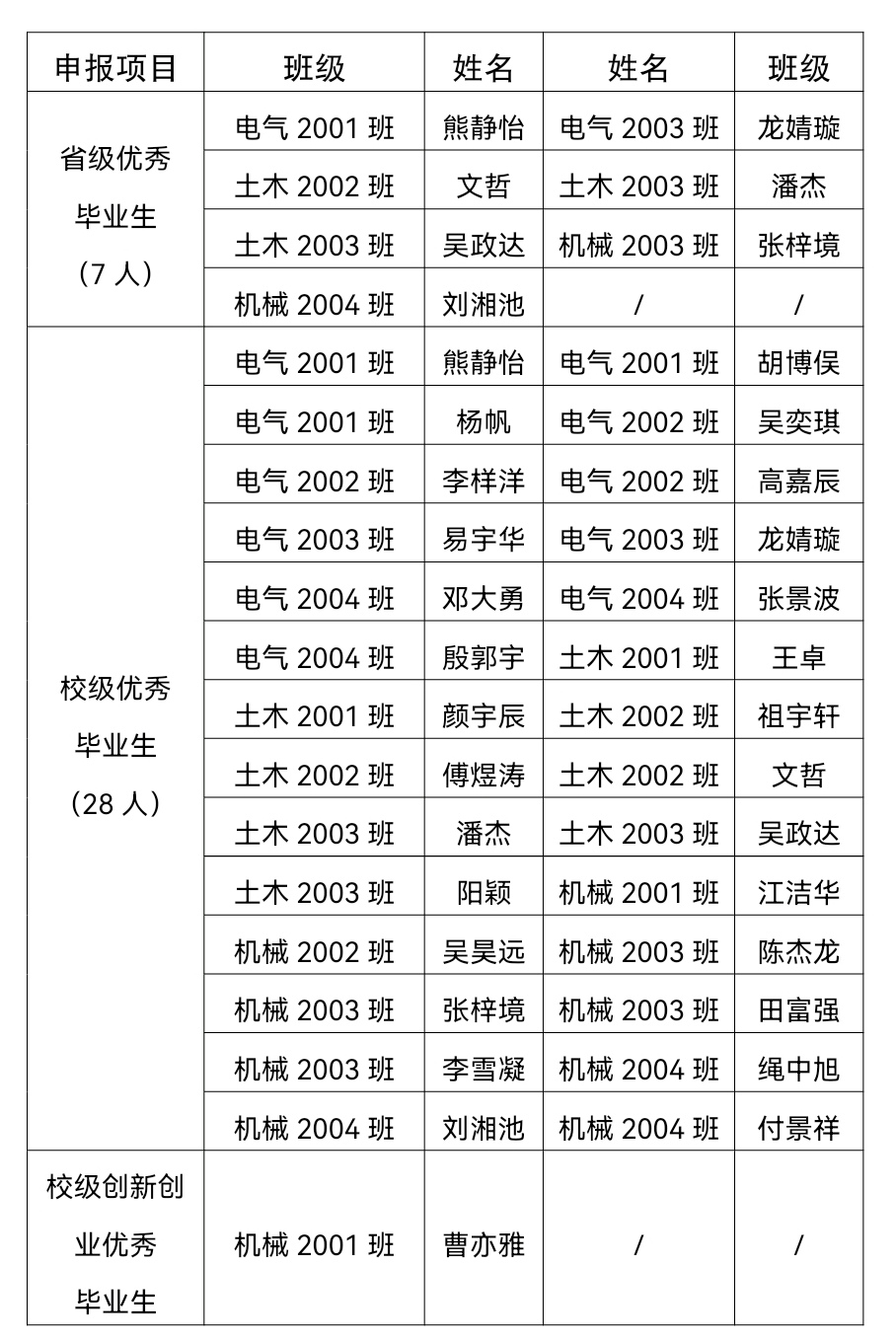 根据《关于评选湖南省普通高等学校2024届优秀毕业生和创新创业优秀毕业生的通知》(湘教通〔2024〕11号)相关要求及学校具体通知安排,经学生申报、班级推荐,学院2024届优秀毕业生评审委员会秉持公平、公正、公开的原则,审核评议,拟推荐以下同学参评2024届“优秀毕业生”,现公示如下: