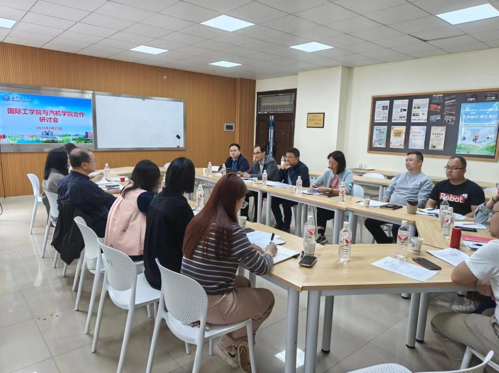 为推动机械设计制造及其自动化中外合作本科教育项目及来华留学生教育高质量发展,4月22日下午,国际工学院院长吴迪龙、副院长黄月华及教务办工作人员赴汽机学院开展交流合作研讨会,汽机学院党委书记孔伟红、院长胡林、副院长唐宏宾及相关人员参加会议,会议由唐宏宾主持。
