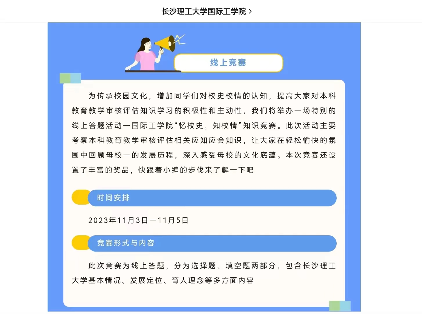 组织开展“忆校史知校情”线上知识竞赛。为传承校园文化,增加同学们对校史校情的认知,提高大家对本科教育教学审核评估知识学习的积极性和主动性,学院举办一场特别的线上答题活动—国际工学院“忆校史,知校情”知识竞赛,主要考察本科教育教学审核评估相关应知应会知识,让大家在轻松愉快的氛围中回顾母校—的发展历程,深入感受母校的文化底蕴。该项活动吸引了学院60余名同学积极参与,同学们在线上自主答题,积极学习教学审核评估相关知识,以赛促学,在线上答题中体会学习的乐趣。