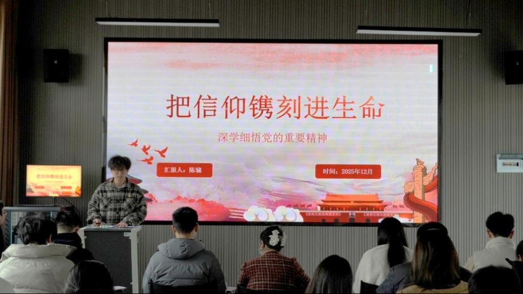 活动伊始,全体与会党员集中观看了微党课视频《把信仰镌刻进生命》。该片通过生动案例和深刻讲述,展现了共产党人坚定的理想信念与崇高的精神追求,为全体党员上了一堂触及灵魂的信仰教育课。随后,学生第一、二支部书记易芙蓉、唐宏敏分别在支部进行了二十届四中全会精神主题报告宣讲,党支部学生党员代表陈骕、赵芸东进行微党课讲授。他们围绕党的二十届四中全会精神及重要文章等分别作了系统深入的分享报告,深度阐释了如何将党的创新理论融入学术科研与日常实践,展现了学生党员扎实的理论功底和积极的学习态度。活动最后,一支部书记易芙蓉、二支部副书记易哲宇分别作总结讲话,围绕全会精神核心要义与实践要求,明确了学习贯彻方向与务实举措。