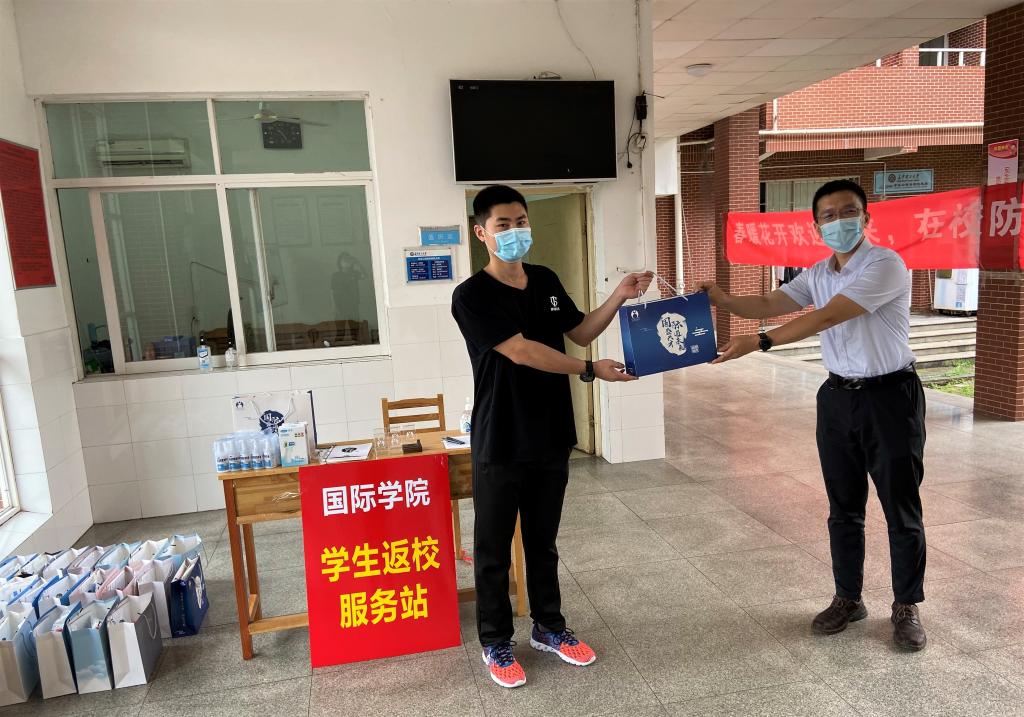 除了消毒液、洗手液、口罩等防疫物资,还有特地为毕业生准备的国风学习册、U盘、平板支架等纪念品——这是MG冰球突破官网国际学院为2020届毕业生准备的“奋斗青春”纪念包。在本学期返校的第一天,学院领导、老师就把纪念包送到了最早返校的毕业生手中。