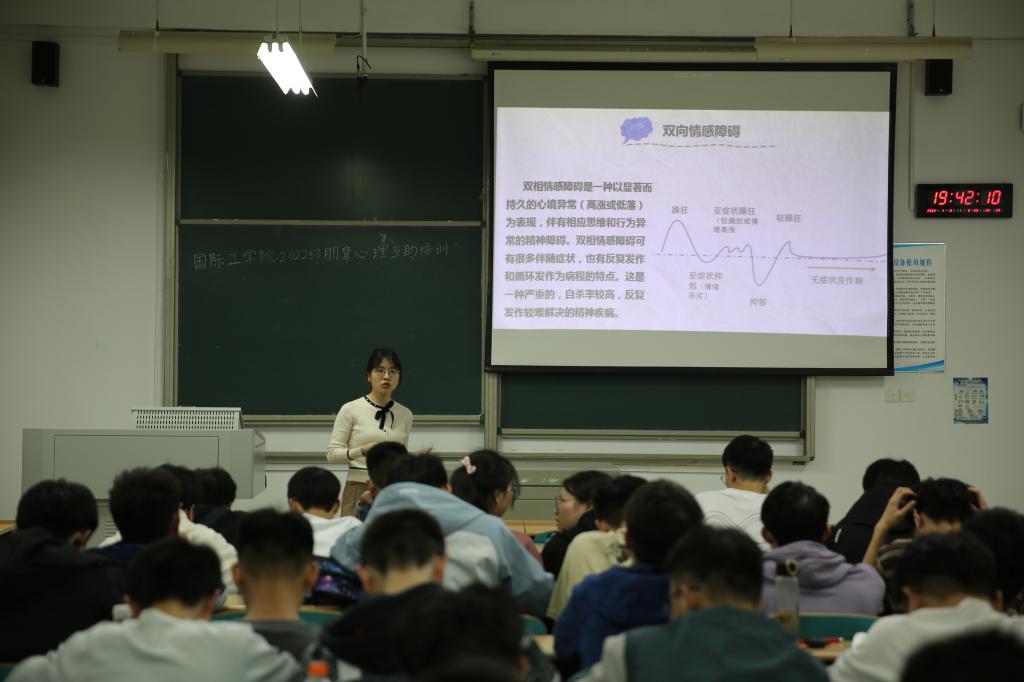 “心理健康是指良好的心理状态,是指人的心理机能能正常发挥。”为引导朋辈心理互助员提供更精细、更温暖的帮助,促使同学们以更加积极健康的心态面对学习和生活,4月10日晚,国际工学院特邀心理健康教育中心专职教师李子萱为2022级朋辈心理互助员讲授上岗培训第二课——“大学生常见精神障碍的症状和识别”。
