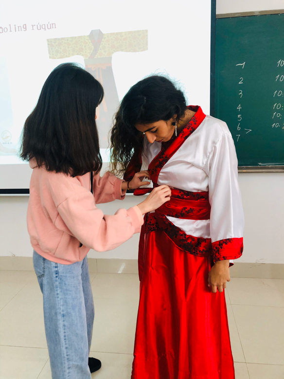 国际学院开展“华夏有衣,曲裾深衣”汉服文化体验活动