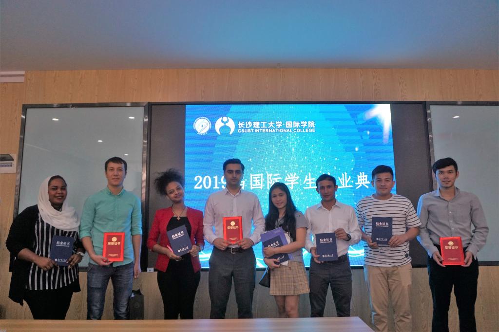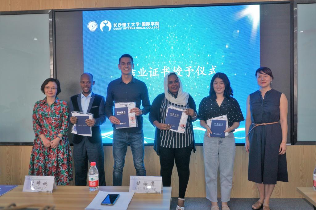 随后,甘海鹰宣读了《关于表彰2019届国际学生优秀结业生的决定》,陈瑜为五名优秀结业生颁发证书和纪念品。多哥籍优秀结业生安妮代表全体结业生发言,她总结了在华学习一年的收获,表达了对MG冰球突破官网和老师们的感谢,并向全体结业生呼吁,要继续加强知识技能和道德修养,向更高的目标迈进。最后,陈瑜、甘海鹰为包括“孔子学院奖学金生”、“湖南省一带一路奖学金生”在内的24名结业语言生,以及5名结束汉语补习阶段的学历生颁发结业证书,并向结业语言生赠纪念T恤。