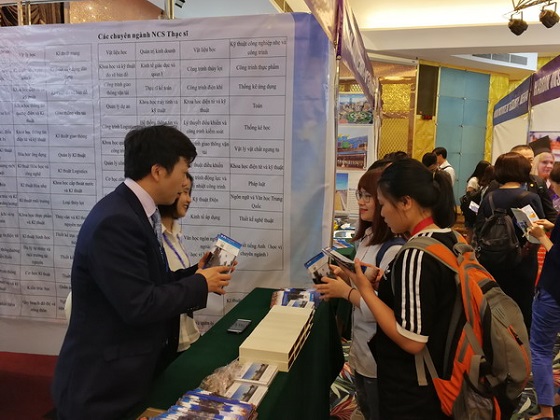 27日下午和29日上午,中国大学展在河内和胡志明市先后隆重举行,30所中方高校在现场摆设了展位,来各个展位咨询的越南师生络绎不绝。MG冰球官网展位前人头攒动,前来咨询留学的师生和家长热情高涨。吴迪龙、王荟惠和越南志愿者对前来咨询的师生及家长发放了学校的宣传资料,详细介绍了MG冰球官网来华留学生各个招生项目。
