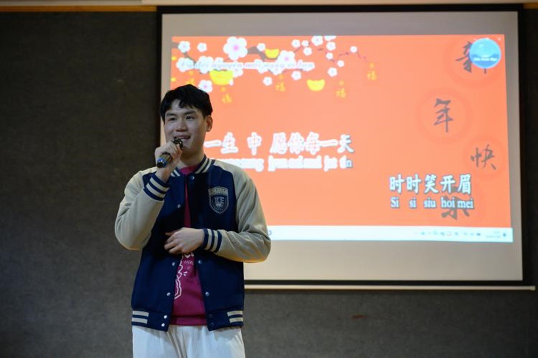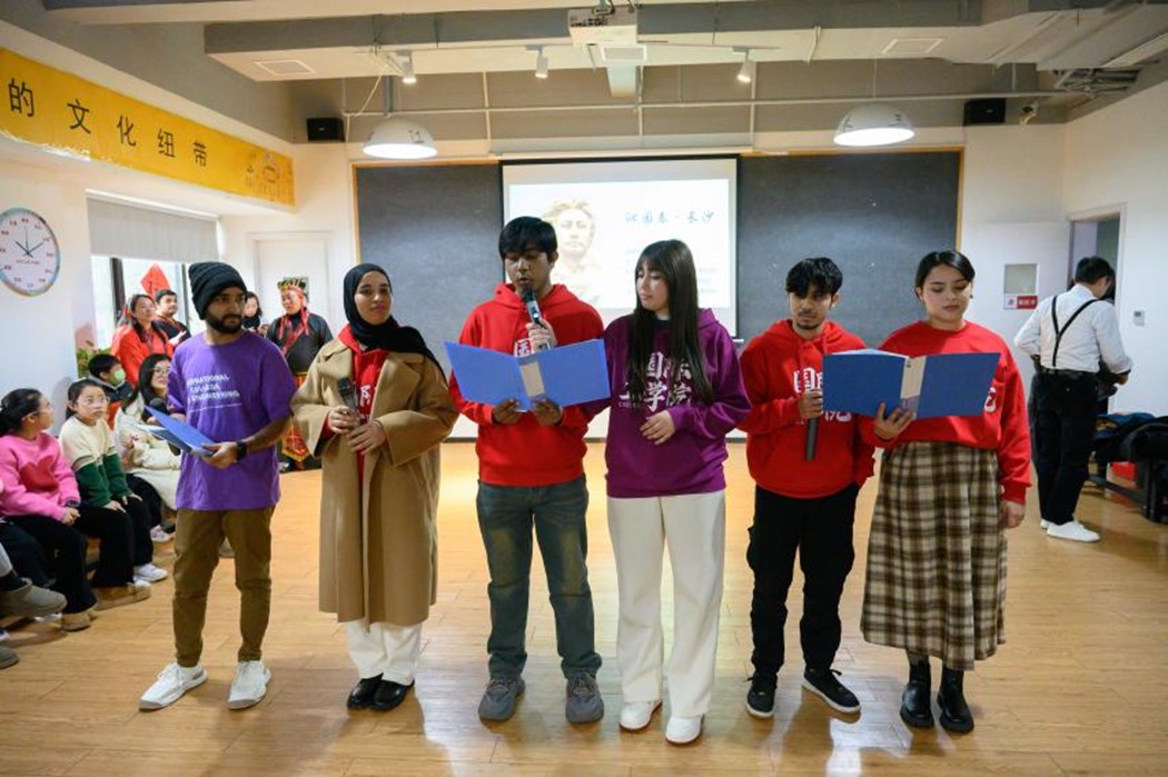在文化交流体验中,留学生身着汉服参与主持,展示他们的独特“中国情”。此外,带来精彩的歌曲演唱《祝福你》及诗朗诵《沁园春·长沙》,联合雨花区老年大学学员、小学生为在场志愿者、社区居民朋友及同学们送去诚挚的新年祝福。
