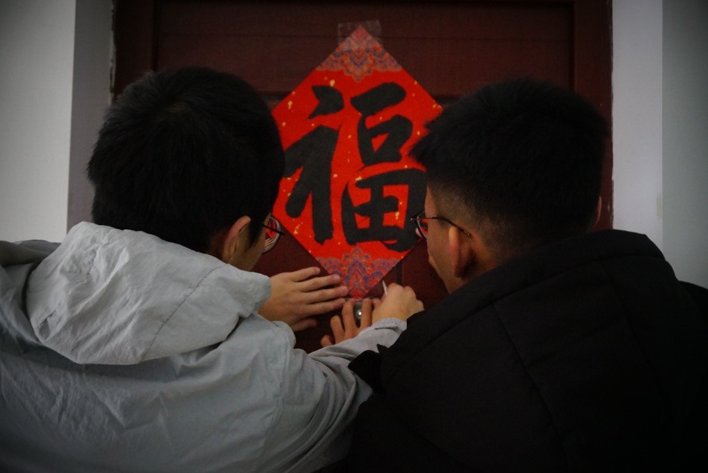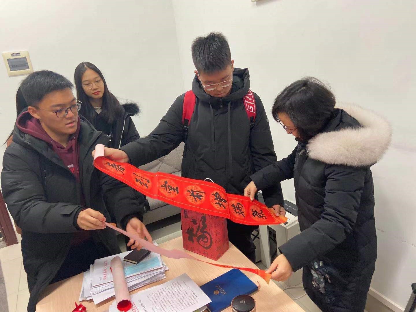 临近寒假,MG冰球突破官网2020级教学改革试点班的每一名学生都成为了“惊喜小分队”的一员,把寄托着祝福的手写春联、手工卡片和年历等礼物,送到了老师们的办公室、教室和学生宿舍里,其中100幅春联、50个“福”字都是由班上的团支书赵胜祥同学书写完成。
