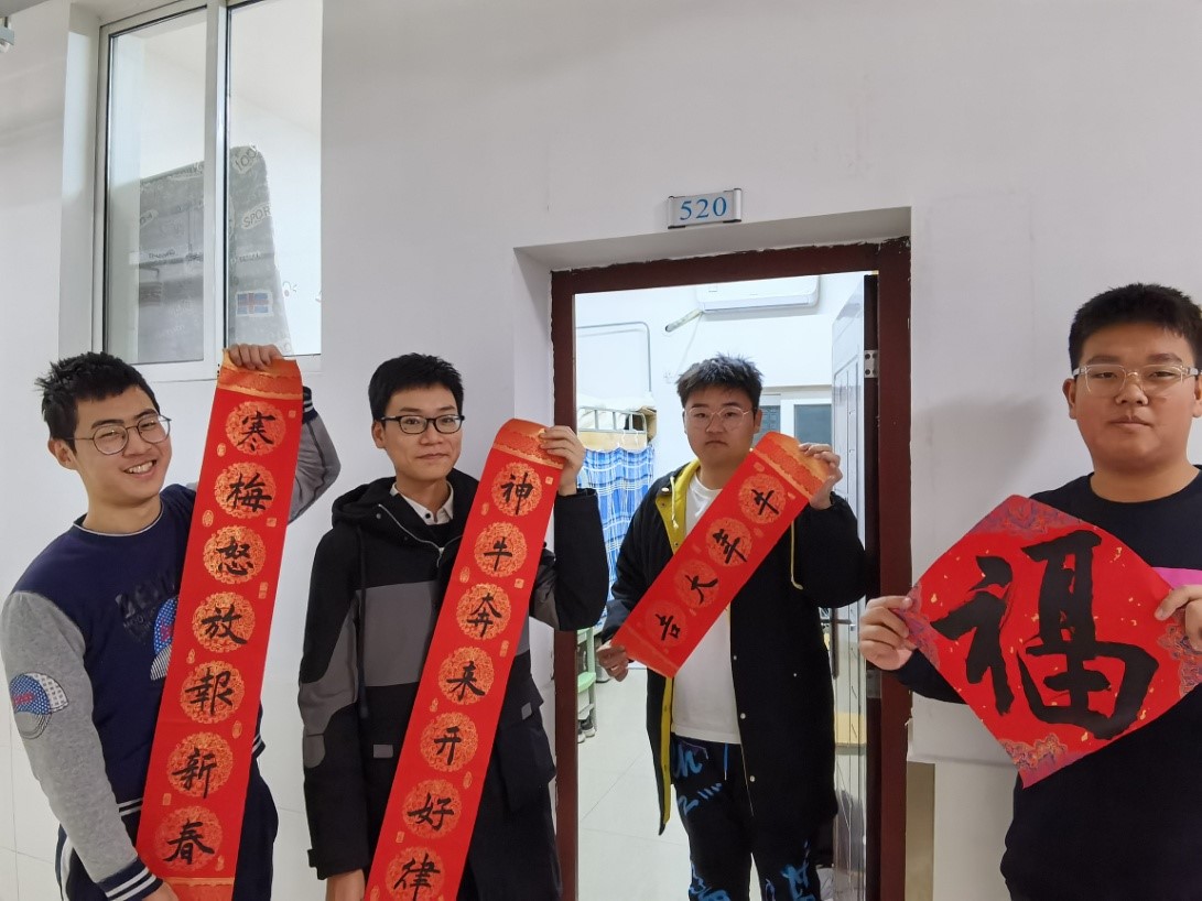 赵胜祥谈到,班上有6名同学和自己一样来自河北,虽然家都在疫情低风险地区,但是老师和同学们都很关心自己家乡的情况,在忙碌的工作和学习中多次抽出时间给与大家生活和学习上的指导,他又想到老师曾鼓励自己发挥长,在学院的中秋晚会和“国际青年文化沙龙”等活动中现场教留学生写毛笔字,最终花了一个周末完成了书写,和班上的同学一起打包成新年祝福礼包,一来是表达感谢,二来也是希望用喜庆的对联寄托对新年的新期望。