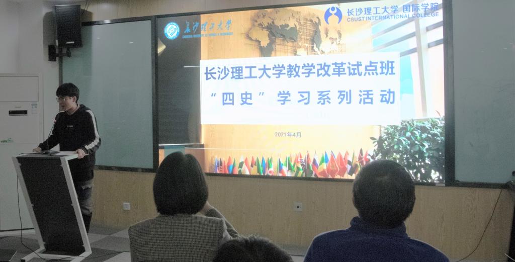 2021年4月16日晚,MG冰球突破官网国际学院2019级和2020级教改班全体同学在新能源大楼402教室开展本学期第二场“四史”学习系列活动。校团委书记王学成、国际学院党总支副书记张锐出席。本次活动由2019级教改班团支书张家明和韩璐主持。2019级第一批入党积极分子代表以“百年瞬间、中国精神”为主题展开分享。
