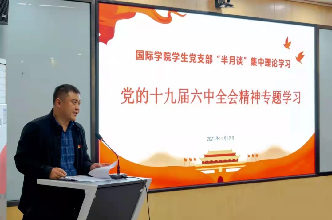 会议开始国际学院学生党支部书记易芙蓉从一个重要主题、两个确立、两个必须清醒认识到、三个需要、党的四个历史时期及其历史成就等五个方面对党的十九届六中全会精神进行了解读。随后国际学院学生党支部宣传组长张李鹏结合自身工作情况,做了党的十九届六中全会学习分享。张李鹏在发言中表示“作为未来国家的主人,我们义不容辞为实现第二个百年奋斗目标、实现中华民族伟大复兴的中国梦而不懈奋斗!”最后,国际学院党总支副书记兼副院长乔法光带领学生党员全面了解了党的十九届六中全会的会议准备过程与《中共中央关于党的百年奋斗重大成就和历史经验的决议》的诞生过程。并表示《决议》是“百年大党总结历史、面向未来的宣言。”