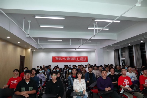 首先,谭哲午带领团员们学习习近平总书记在中国人民大学的讲话精神。他号召同学们共同践行“不负韶华,不负时代,不负人民,在青春赛道上奋力奔跑,争取跑出当代青年的最好成绩。”随后,杨富坤、李家鑫、向科全、龙华强、余福源等7名团员代表从共青团的成立、团旗团徽团歌的规范使用、共青团的章程、早期团员黄爱的故事、张太雷与共青团的故事等角度向大家介绍建团百年来的峥嵘历史,分享自己的思考,团员们的宣讲情绪饱满,他们表达了对悲壮历史的缅怀令人动容,对前辈英雄的敬意,及为祖国建设添砖加瓦的决心与担当催人奋进。