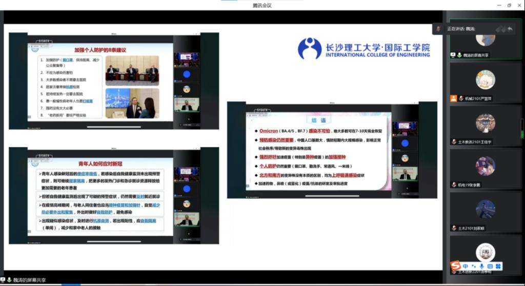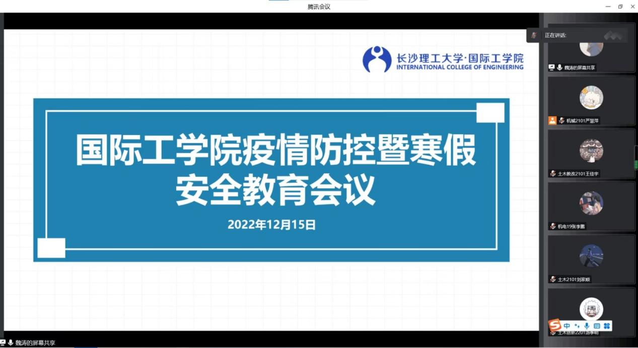 为切实做好2022-2023学年寒假期间学生教育管理工作,确保学生健康生活、校园安全稳定,12月15日晚,国际工学院召开疫情防控暨寒假安全教育线上会议。会议由辅导员魏涛主讲,学院全体班长参加。