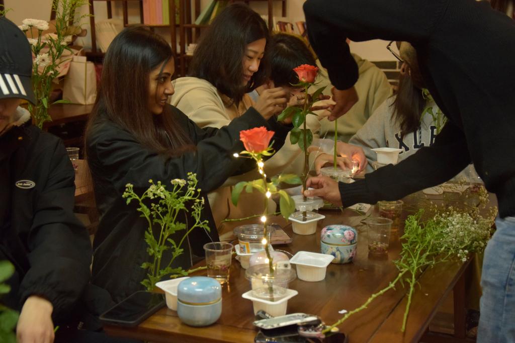 在“贯穿古今,插花寻春”环节中,学生们自由选择心仪的花束与配花。在花香绕梁的氛围下,学生们积极配合,创作出许多构思巧妙的插花作品。