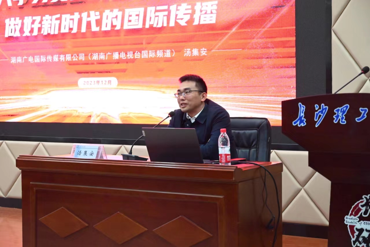 开班仪式过后,汤集安结合自身的教育工作经历,以“如何做好新时代的国际传播”为主题,为青马班学员讲授开班第一课。汤集安从处于百年未有之大变局,外宣工作面临划时代的变化、产生的问题以及应对办法等方面展开讲解,分享文化宣传和新媒体运营的经验。针对外宣工作面临的困难,汤集安列举了生动详实的事例,指出新时代的宣传应改变宣传观念、切换固定模式、增加地方力量、搭建外宣平台,推进外宣工作的发展。会议最后,汤集安建议新时代青年要开创、引领潮流,坚持守正创新、自信自立,坚持系统观念,胸怀天下,助力国际传播走得更稳、更远、更好。同时,他也鼓励同学们珍惜大学时光,担负文化使命,培育新媒体素养,积极进取,实现个人全面发展。
