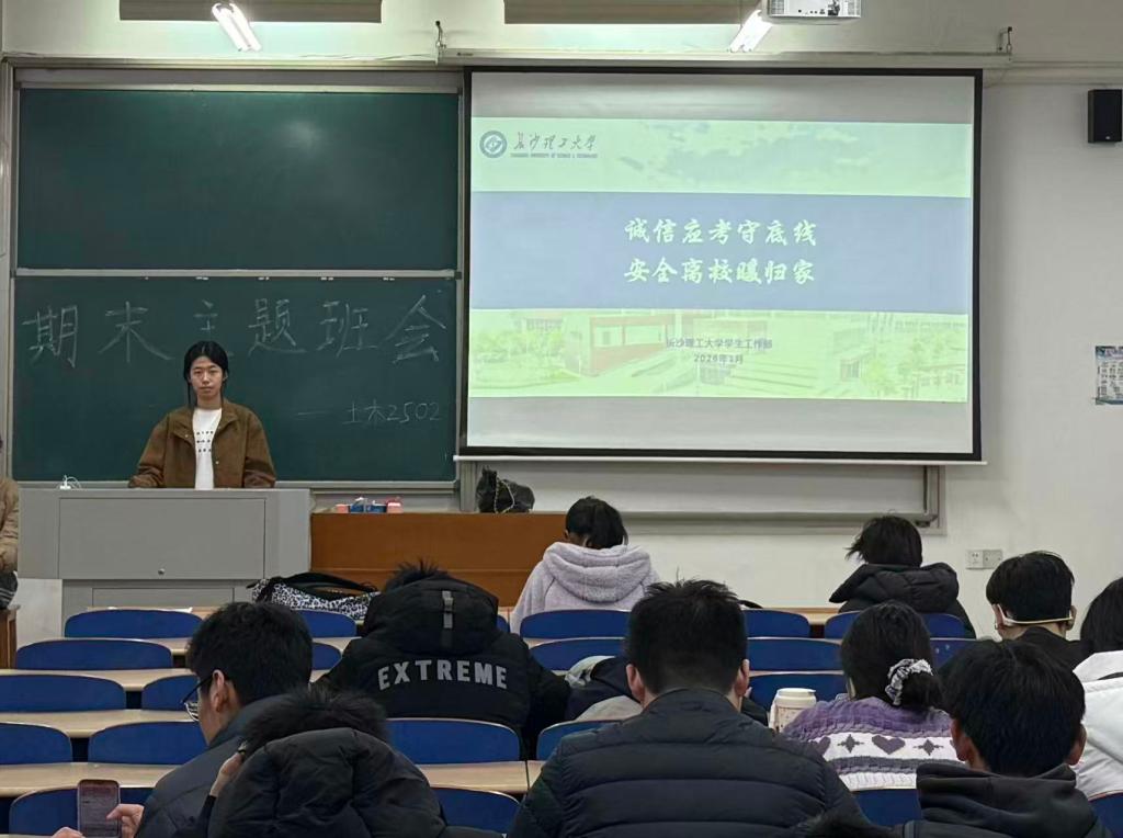 本次班会的核心内容为考风考纪和诚信应考教育、期末安全教育、期末人文关怀与精准帮扶共三个方面。各班级组织学生系统地学习了《MG冰球突破官网学生考试违规处理办法》等文件,结合典型案例剖析违规后果并以班级为单位完成了《诚信考试承诺书》签署;围绕消防、反诈、校园交通等安全要点,通过视频学习、案例讲解开展专题教育,明确离校报备流程与返乡安全要求;同时班长针对学业压力、经济困难等问题讲解了心理健康支持渠道与特困补助申请方式。
