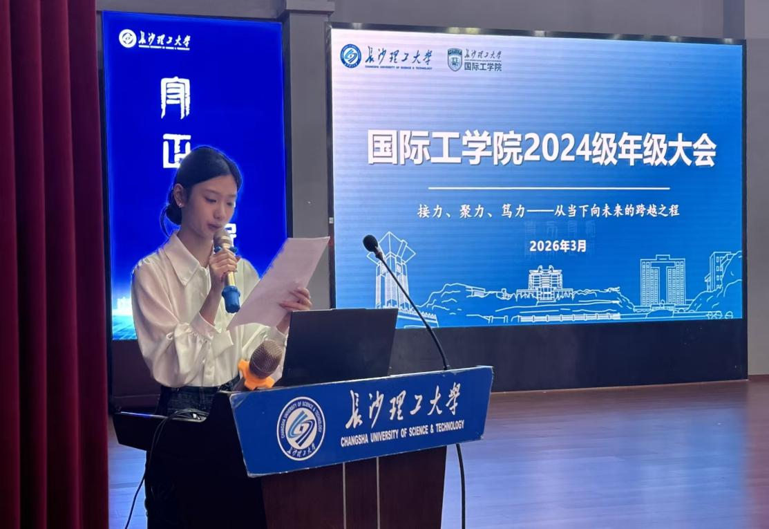 为扎实推进学风建设,明晰年级管理要求,规划学期发展方向,2026年3月,MG冰球突破官网国际工学院2024级“接力、聚力、笃力——从当下向未来的跨越之程”主题年级大会在学生活动中心科技报告厅顺利举行。国际工学院2024级辅导员易芙蓉、2024级全体学生参与本次大会。