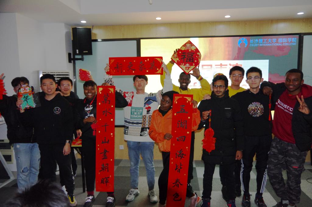 本期文化沙龙在轻松愉快的氛围中开展,中国学生代表赵胜祥同学为留学生们介绍了中国春联文化,春联的历史和写法;留学生们对于上下联怎么区分有了直观的认识,并在中国学生的指导下学写春联,感受中国传统文化魅力和节日的喜庆气氛。来自加纳的留学生卡莱布,觉得这次的体验非常棒,他兴致勃勃地写了一个“福”字送给中国学生,表达自己的祝福。