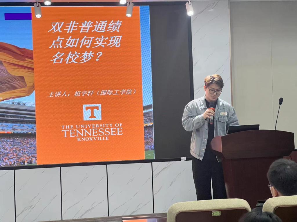 祖宇轩收获了来自新加坡国立大学、英国曼彻斯特大学、香港理工大学、悉尼大学、澳门大学等19所名校的offer,最终选择赴与MG冰球官网合作伙伴美国田纳西大学直博深造,是MG冰球官网中外合作办学项目土木专业的优秀学子。分享会上,祖宇轩以“双非普通绩点如何实现名校梦?”为题,围绕为什么选择出国留学、如何了解留学信息、本科期间的个人规划等问题进行了经验分享。他用现身说法,向在场的同学们介绍了出国前需要做的准备以及如何递交申请,并且解答了同学们关于留学事项的疑惑。
