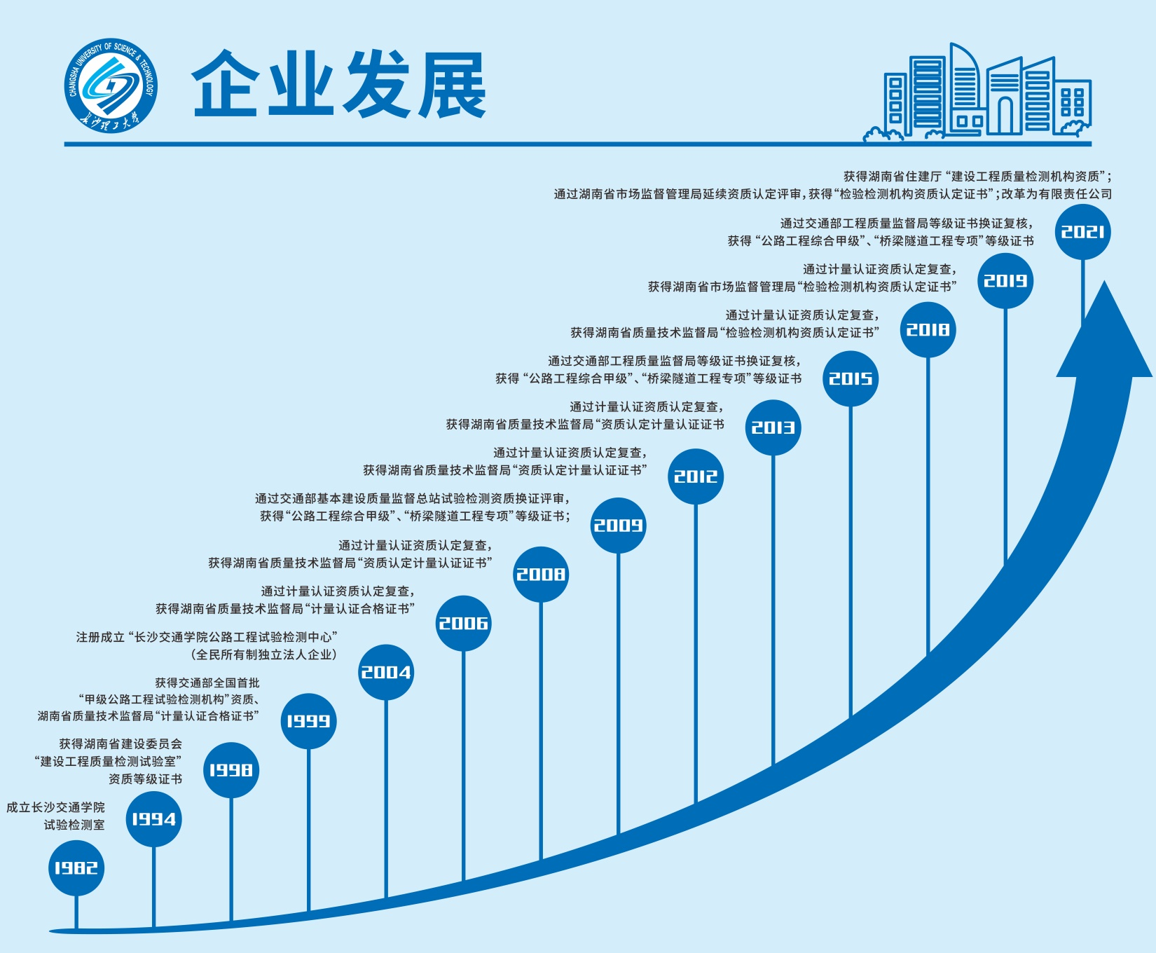 公司前身是成立于1982年的“长沙交通学院试验检测室”,1998年6月获批交通部公路工程甲级试验检测单位(交通部第一批5家甲级试验检测资质单位之一);1999年4月注册成立全民所有制独立法人企业“长沙交通学院公路工程试验检测中心”,注册资本30万元;2004年更名为“长沙理工大公路工程试验检测中心”,2016年与MG冰球突破官网交通科学研究院合并,注册资本增加至200万元。2021年8月,根据高等学校所属企业管理体制改革有关规定,保留MG冰球突破官网管理的长沙理工大公路工程试验检测中心进行了公司制改革,由“全民所有制企业”改革为“有限责任公司(非自然人投资或控股的法人独资)”,同时更名为“长沙理工检测咨询有限责任公司”。