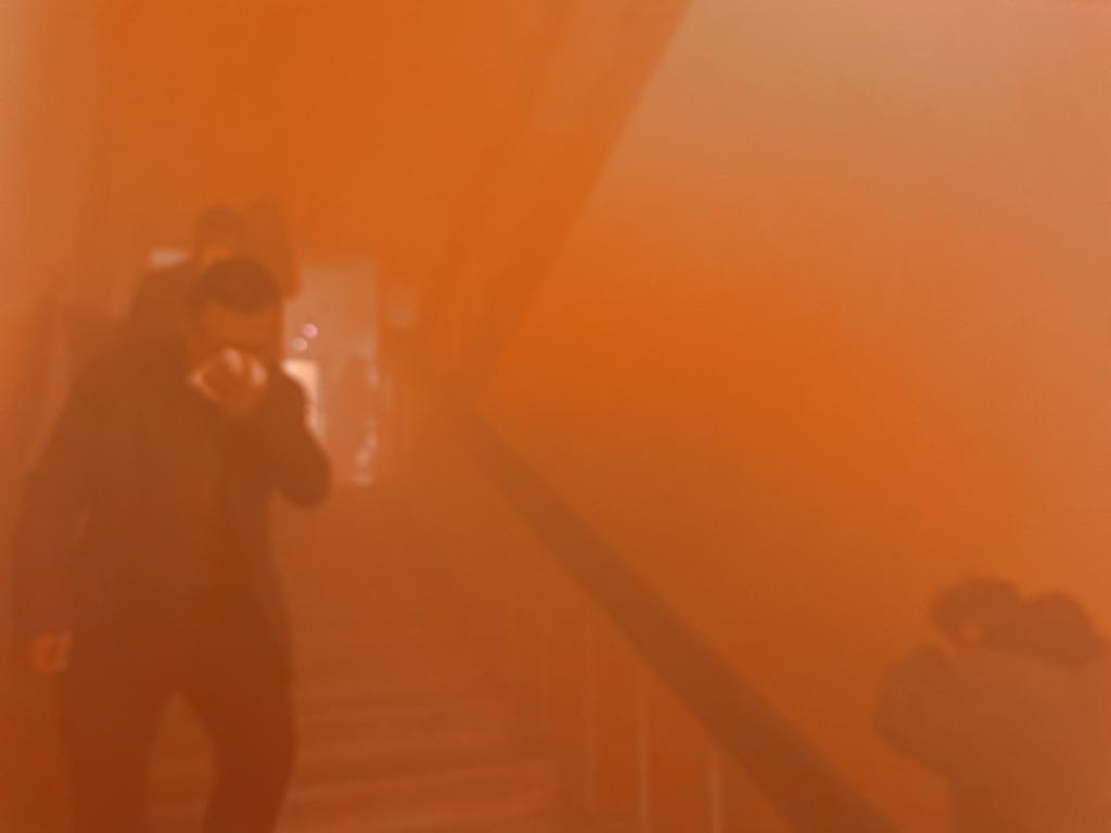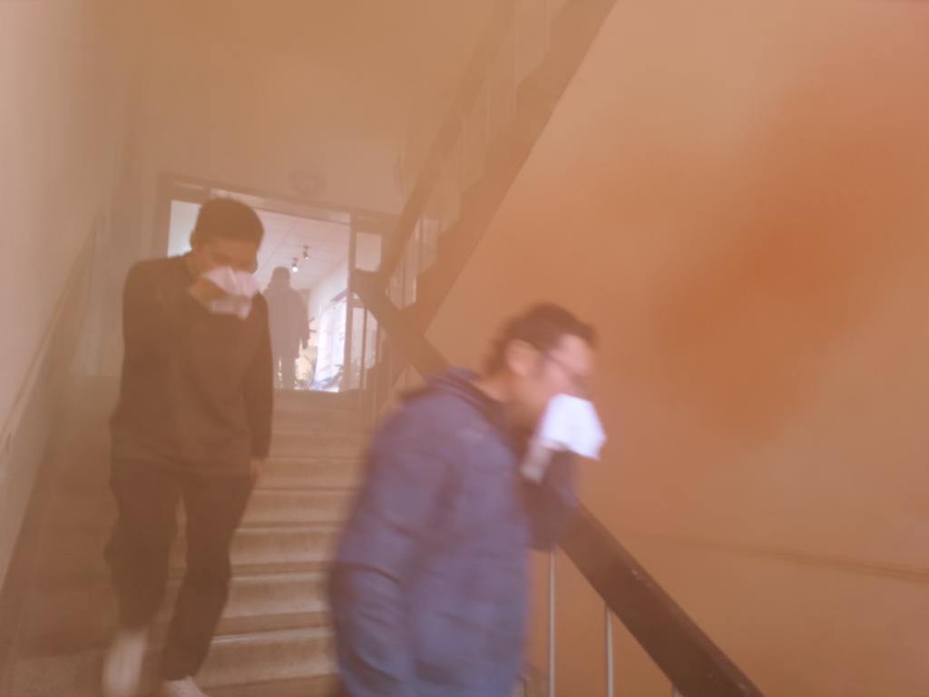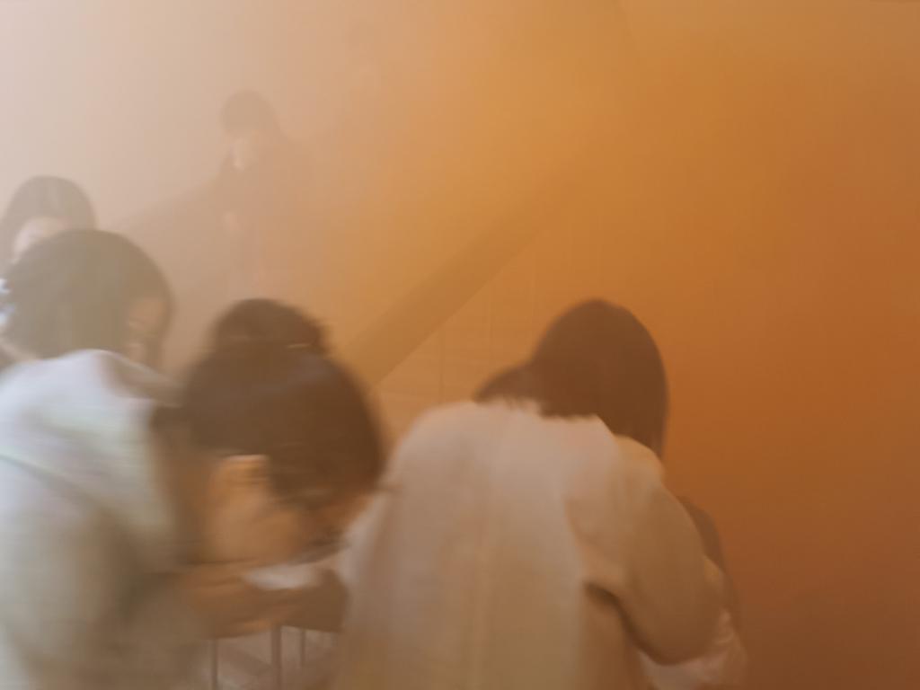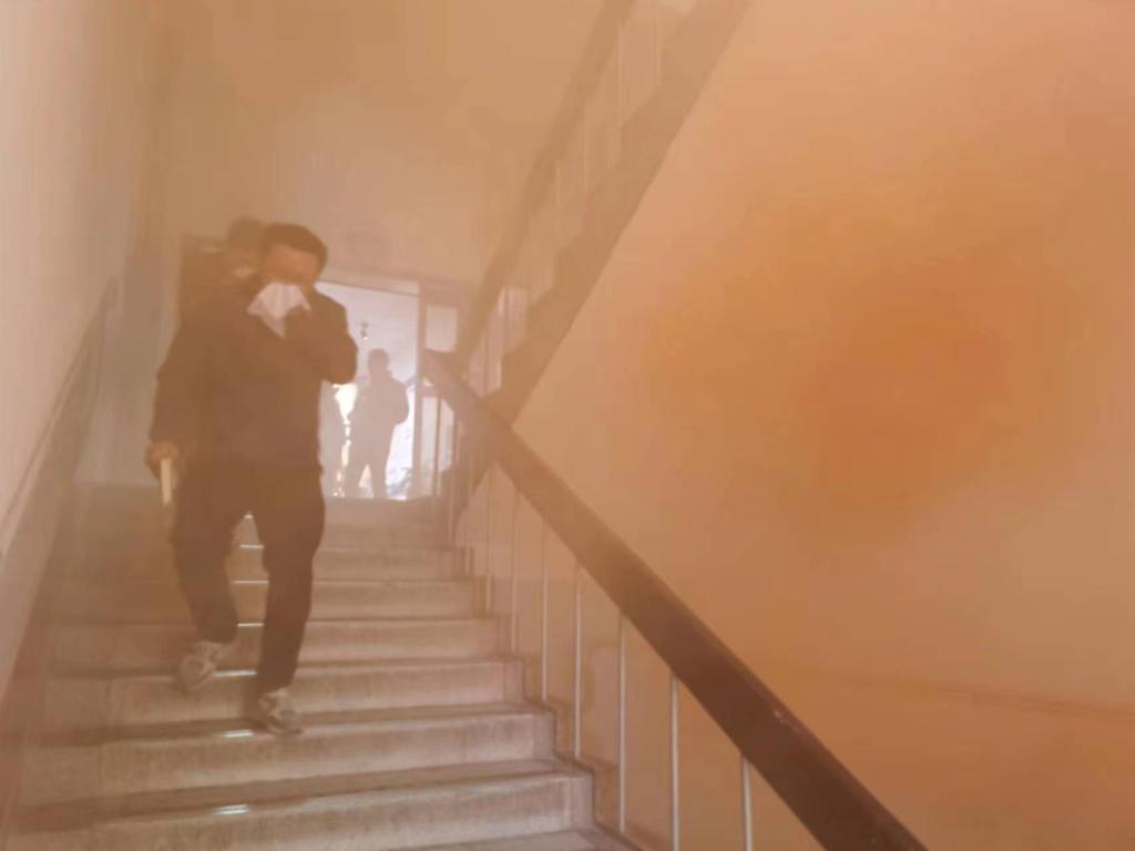 在逃生疏散演练时,随着烟雾弹喷出的股股浓烟,安全员拉响了消防警报,并大声呼喊“着火啦,大家尽快撤离 …… ”,员工们按照培训时学习的逃生方式,迅速用湿毛巾或衣袖捂住口鼻,弯腰低姿有序沿着消防通道、消防楼梯快速地撤离了“着火”的办公大楼,抵达安全区域。安全员在组织大家紧急疏散的同时,按照发生火灾的应急处置预案,第一时间“拨打”了119电话报警,并向学校保卫部报告。
